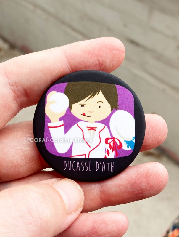 Graphisme création originale Coraline Rivière pour la marque Coraï sur le thème de la Ducasse d'Ath: dessin du Petit David visant le géant Mr Goliath, pourvu que ce soit une année de chance! Dans les couleurs officielles d'Ath: jaune, blanc et mauve.